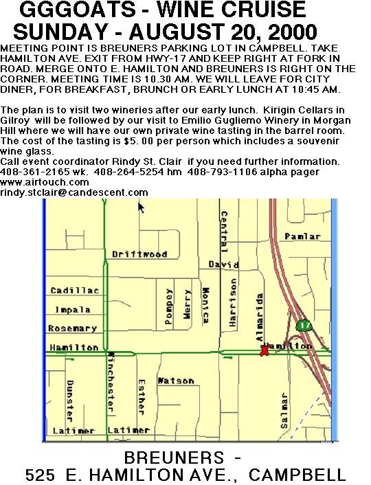 Looking forward, please feel free to send me any ideas on next years 5th anniversary blowout with Jim Wangers. Oct. is the planning meeting and I would prefer to have some ideas going in. Want to throw this one out at you now;our meeting schedule has Sept. & Nov. in San Leandro and Oct. and Dec. in Redwood City. Sept. meeting will be used for general business and Wangers pre-planning. Oct. is the planning meeting for Jim Wangers. We need to set a goal of leaving that meeting with at least an outline of the event and the people in place to make it happen. Nov. is the brainstorming meeting for our 2001 event schedule. This is a critical meeting. I made the commitment to have some of these meetings in San Leandro. Initially the turnout was phenomenal until the novelty wore off. The last couple have left a bit to be desired attendance wise. These comments are directed at those of you that can (or will) make San Leandro but NOT Redwood City. If we do not draw the " locals " to San Leandro and it is more convenient for the rest of us to have it in Redwood City, you get my drift. I applaud the commitment and dedication from those of you that attend regardless of location. Keep in mind that San Leandro has us all facing commute traffic and it will be worse in winter. Here is the bottom line, if September's attendance is not " normal "as in Redwood City normal, look for me to suggest moving November's meeting back to Redwood City. Nuff said.