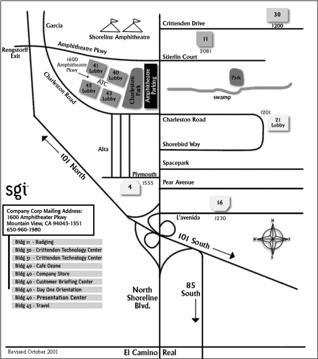 Highway 101 traveling north, exit at Shoreline Blvd. Follow exit ramp as it curves to the right. Turn left at